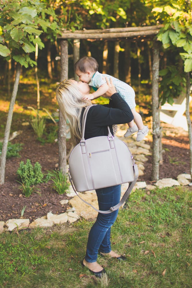 This is one of my favorite diaper bags - this is with me and my boy Conrad! I love how it is formed to sit up when I put it down!