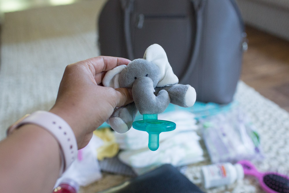 Pacifiers. Even if your baby won't take it, bring one just in case. You can't believe how often my little Lorelei (who hates pacifiers) would take one in the store!